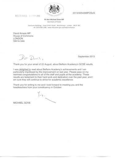 Michael Gove Congratulates Belfairs Academy Achievement 12th September 2013 Michael Gove Congratulates Belfairs Academy Achievement Local News